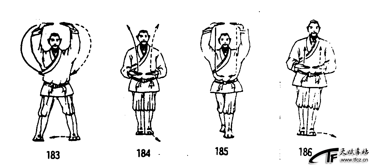 导引养生功动作之四。8拍动作:①随着吸气,提肛调裆;重心移至右脚,右腿半蹲,左脚向左开一步,略宽于肩,随着重心移到两脚之间将腿逐渐伸直;同时两掌分别向左右、向上划弧摆至头顶上方,两臂均成弧形,掌心朝上,掌指相对;眼平视前方。(图183)②随着呼气,松腹松肛;重心移至右脚,右腿半蹲,左脚向右脚并拢,随之两腿伸直;同时两掌分别向两侧下落收于腹前,臂微屈,掌心朝上,掌指相对,掌距腹前和两掌之间的距离各为10厘米左右;眼平视前方。(图184)③~④拍同①~②拍,唯右脚向右开步做动作。⑤随着吸气,提肛调裆;重心移至右脚,右腿半蹲,左脚向前上步,重心缓缓移到前脚(左 ......