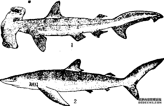 脊椎动物,鱼纲,极鳃亚纲,鲨目。为一群海生(极少数可进入淡水)的鲨目(sela-choidea)鱼类的通称。身体一般呈纺锤形,分为头、躯干和尾3部分。体表具有细小盾鳞,体侧有侧线,体长约1—20米。全身骨骼均为软骨,头骨和脊椎骨钙化,故而有一定的坚硬度,脑颅无骨缝。头端扁平,近胸鳍处略粗,向后渐细,腹部较平坦,口在头的腹面,横裂,上颌和下颌具有发达的锐齿。口的前面有鼻孔1对。鳃裂位于头的两侧,每侧有5—7个,无鳃盖,鳃间隔发达,鳃片由上皮组织折叠形成栅板状,故鲨类(selachii)又称板鳃类(Elas-mobranchii)。背鳍1—2个,尾部侧扁,尾鳍发达,歪形尾,适于在中上层水域中游泳。臀 ......