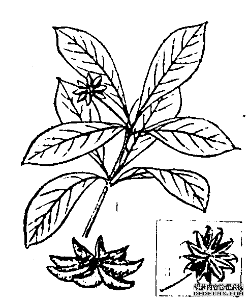 双子叶植物,木兰科。旧名“八角茴香”,俗称“大料”。热带高原小乔木,产于我国广东、广西、云南等省。约有四五百年历史,以广西产量最多,质量最优。花红色。果实为聚合蓇葖果,成熟时为红棕红,木质化,上面开裂成7~9个小船状木质化的小蓇葖果,俗称“果瓣”,多数为8个,排成1轮,每个“果瓣”的顶端钝尖,里面有1粒闪光的黄棕色大粒种子,故称“八角”。“果瓣”和种子都有一种特殊的刺鼻香味,可作为调味香料用。有一种与大料非常像的“莽草”,也开红花。果实开裂成8~12个“果瓣”,也排成1轮,每个“果瓣”里有1粒黄色种子,但“果瓣”的顶端尖而长,并且弯曲成钩状 ......