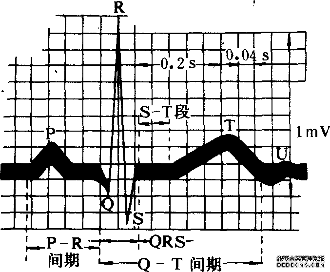 指心脏活动过程中所产生的生物电,用心电图机从体表特定部位引导出来的电变化线条图。在心动周期中,心脏各部位有规律地兴奋,其兴奋过程所发生的生物电变化的方位、次序、时间等都有一定规律。由于机体组织及体液有传导性,故可在体表一定部位用心电图机引导出心脏各部位电变化的产生、扩布与恢复过程。通过心电图的分析可了解心脏活动情况和诊断疾病,特别对心律异常和心肌梗塞有很大参考价值。正常心电图分为P、Q、R、S、T,5个波。