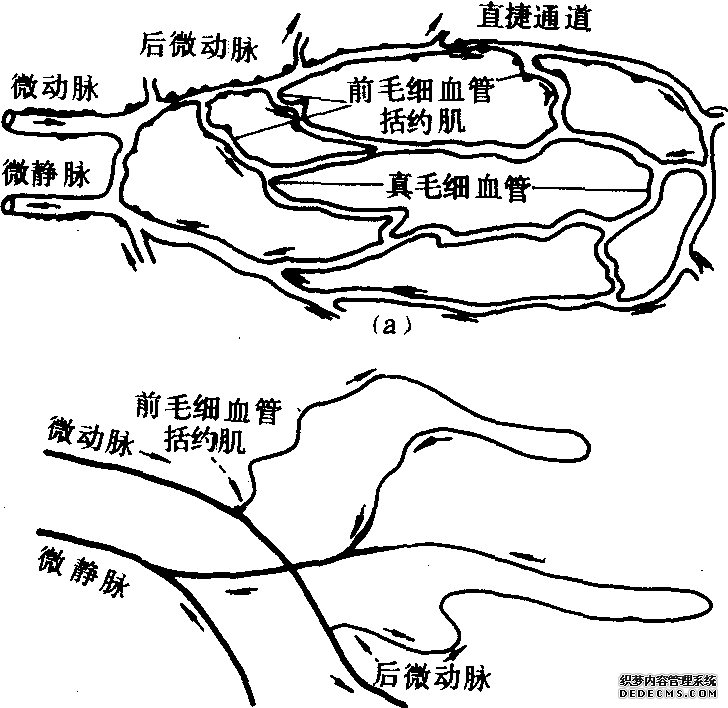是指微动脉与微静脉之间的血液循环。相应的血管称微循环血管。简单的微循环,如人手指甲的微循环,仅由微动脉、微静脉及两者间呈袢状的毛细血管组成。典型的微循环由微动脉延伸为后微动脉,后微动脉再发出两种血管, 一是直接延伸为较粗的通血毛细血管或称直捷通路,经常处于开放状态,其功能是使一部分血液迅速通过微循而回心。直捷通路有旁支与真毛细血管相通。另一种是真毛细血管,在其起始部有平滑肌,即毛细血管前括约肌,其收缩或扩张可控制流入真毛细血管的血量。真毛细血管穿插于细胞间隙,互相连通成网称真毛细血管网或迂回通路。真毛细血管管壁薄,血流缓慢,是血 ......
