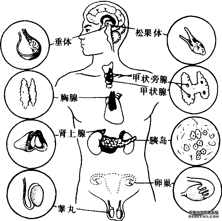 指分布于人体一定部位没有导管的腺体,故又称无管腺。其分泌物为激素,借血液或淋巴输送至全身以发挥作用。内分泌腺细胞大多排列成团块状、索状或板状,只有少数呈囊泡状(如甲状腺)。内分泌腺可分为两类,即内分泌器官和内分泌组织。内分泌器官是指独立存在、肉眼可见的腺体,如垂体、松果体、甲状腺、甲状旁腺、肾上腺等。内分泌组织是指存在于其他器官内的腺组织,肉眼难以分辨,如胰腺内的胰岛、胸腺内的网状上皮细胞、睾丸内的间质细胞和卵巢内的卵泡及黄体等。此外,还有许多器官,如胃肠道、胎盘、肾脏以及神经系统等,也兼有内分泌功能。如神经末梢分泌神经介质,丘 ......