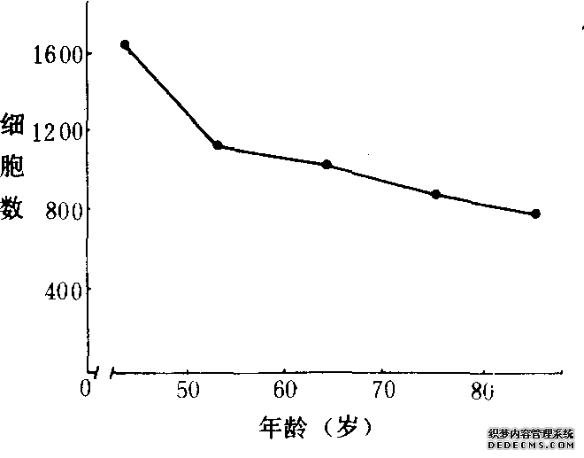 神经细胞数量随增龄而减少可见于大脑和小脑,而脑干以下部位则很少发现有细胞数量减少现象。据研究,95岁老人大脑皮层中央前回的神经细胞数量仅为19岁时的1/3。额上回神经细胞从40岁开始减少,至80岁时减少约1/2。脑细胞数量减少可见于大脑皮质的各层,但以第2层和第4层(即内颗粒层和外颗粒层)最为明显。