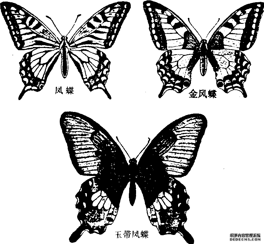 无脊椎动物,昆虫纲,鳞翅目,凤蝶科蝶类的总称。全世界多达850余种,我国约有近百种。大型昆虫。翅2对,较大,上密生有各色鳞片,形成多种绚丽具有光泽的花斑,后翅外缘波状,并具有明显较长尾突,善于飞行。体被鳞片和短毛。口器特化成喙,平时呈螺旋状卷曲,吮吸花蜜时可伸直。完全变态,1年繁殖1~2代。卵球形,分散在叶片上。幼虫第1胸节背面有1个分叉的臭角,触动时能突然伸出,并能发出一种特殊的臭气,为凤蝶独有特征。幼虫植食性,多种幼虫以柑橘、樟等树叶为食。常见的为凤蝶属的花椒凤蝶(Papilio xuthus),翅展约7厘米,黄绿色,有黑色斑纹;危害柑橘等果树的玉带凤蝶(Pa-pil ......