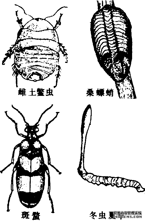 用虫体的全部或一部分,或用其产品经加工制成药物的昆虫。种类很多,所含成分复杂。可用全虫入药的,如干燥土鳖雌虫(雄虫不作药用),性寒、味咸、微毒,内服有破淤通经功效,主治跌打损伤、闪腰、岔气和腰痛的功能。有大毒的斑蝥干燥成虫,经去头、足和翅后,也可研末入药外用,有主治急性扁桃体炎、咽喉炎的功效,内含斑蝥素,近年认为对癌细胞有杀伤作用。用昆虫产品入药的,如桑螵蛸(刀螂子)是螳螂的卵鞘,有补肾壮阳、固精缩尿的功效,特别是对老年人或体虚人小便频数及神经衰弱等有一定疗效;冬虫夏草是由虫草蝙蝠蛾的幼虫和虫头长出的一种子囊菌,即冬虫夏草菌的菌座组 ......