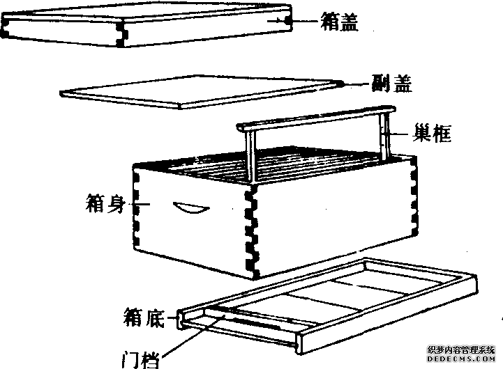 普通多用22毫米厚的木板按一定大小尺寸制成可供蜂群生活的木箱。使用最广的蜂箱为10框标准蜂箱,又称“郎氏标准蜂箱”,标准蜂箱是由箱身、箱盖、箱底和副盖组成。箱身内径长465毫米,宽380毫米,高245毫米。箱内可容放留有蜂路的10个巢框和1块隔板(蜂群不满10框时,可用隔板隔断空隙,调节蜂巢的大小,保持巢内温度),在箱底的前面留有1个可左右移动的小巢门,专供蜜蜂出入。箱盖制成活动的,可以自由取下或盖上,顶板上应加钉防雨材料;蜂箱内挂有一定数量的巢框,用来装架巢础,蜜蜂可在上面建造巢脾。巢脾内如已贮满蜂蜜,可随时取出蜂蜜。整个蜂箱可运到蜜源较多的地方进行短途 ......