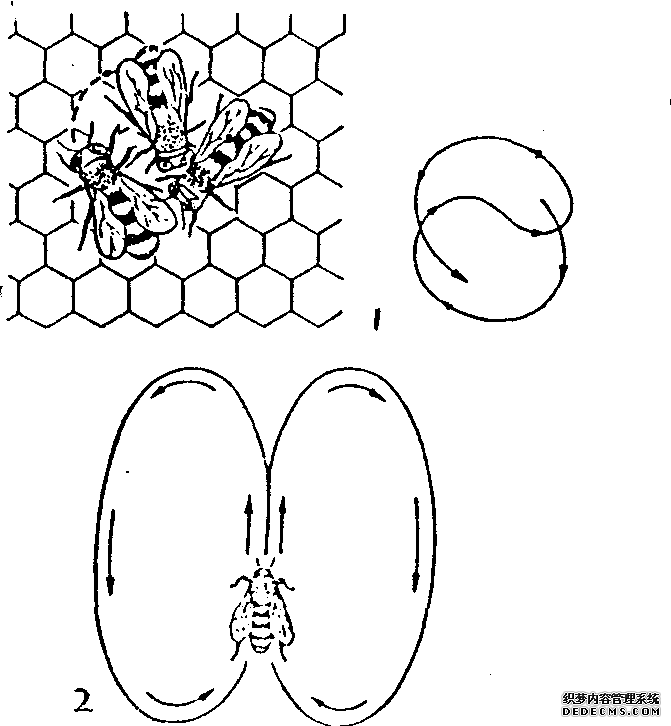 蜜蜂中的侦察蜂所特有的一种传递信息的“舞蹈”动作。用不同舞姿对巢内的工蜂传递蜜源地、蜜源的方向与距离,使其依一定路线去采集花蜜和花粉。时而向左,时而向右爬行成小圆圈式的“圆舞”,即表示蜜源距蜂箱约在100米以内的信息;如在蜂房上先沿直线爬行,再向左和向右呈弧状交错爬行,似横“∞”字的舞姿,表示蜜源距蜂箱较远。在沿直线爬行时,腹部不停左右摆动的“摆尾舞”,有时持续1秒钟,表示蜜源距蜂箱约有500米,如持续2秒钟,则表示约有1000米。如头部向下爬行跳“摆尾舞”,表示蜜源位置背向太阳;相反,头部向上,表示蜜源位置对着太阳。当侦察蜂直线爬行后,再向左 ......
