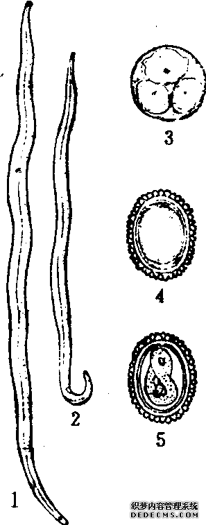 又称“人蛔虫”。无脊椎动物,线虫纲。寄生在人体小肠内最普遍的一种寄生线形动物。成虫身体细长,圆柱形,表面光滑,有些像蚯蚓,中间较粗,两端细,头端尖,故又称“似蚓蛔线虫”。人不注意饮食卫生,吞入感染期蛔虫卵后,最容易传染蛔虫病。由于蛔虫身体最外有1层较厚的角质层,可以保护它在人肠内生活。寄生在体内的蛔虫,少的有1条,多的有数十条。雌蛔虫每天能产约20万粒虫卵。成虫的寿命约有1~2年。在我国,蛔虫的感染率,儿童高于成人,农村高于城市。往往是人刚干完农活后,手上污染有蛔虫卵,尚未洗手便取食自吃,或用手拿、掰、划、喂给儿童吃而引起的。应牢记“ ......