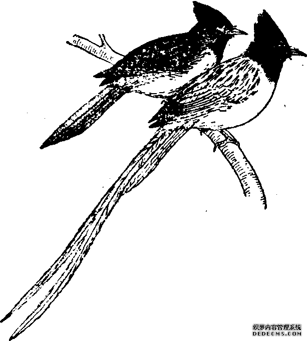 又称“长尾鹟”,俗称“白带子”、“一枝花”。雀形目,鹟科。雌雄鸟外形的差异明显。雄鸟体长约30厘米(包括2根长尾羽),羽冠较长,雌鸟无长尾羽,羽冠较短。羽色有白色和栗色两种。但头、颈部均有蓝黑色,并有金属闪光。鸣声响亮而急促。羽色和体态美丽,很有观赏价值。但笼养上食困难,往往因为吃不到活飞虫而死亡。一般需在大鸟笼的外面罩上一层纱窗料,从笼底开的小孔投送活的飞虫去引诱捕食。数日后逐渐减少活虫,用死虫诱食,只要能吃死虫,即可将死虫放在绣眼粉中,使其啄食粉料,如能成功,即可养活。但还需要补加活虫和习蛾。如能获得雏鸟,可直接用粉料饲喂。