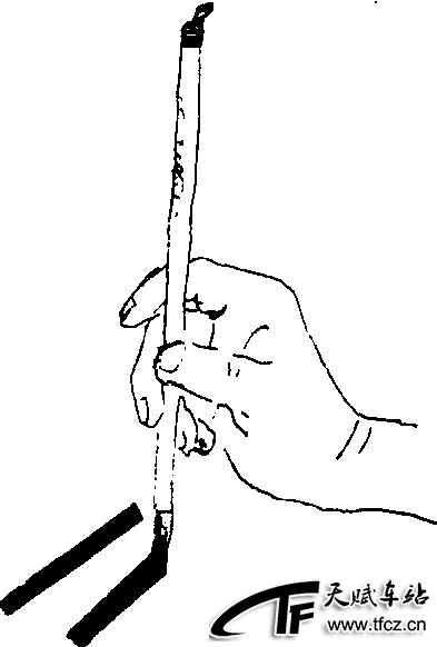传统书画用笔的主要锋法。中锋用笔,执笔正中,笔管垂直,运腕虚悬,提笔中含。行笔时,笔与纸面保持竖直状态,笔端在笔道中间,笔尖直下,藏锋内转,使墨水畅流四面圆足,达到圆润而有力。采用中锋,以不同的线来勾勒所绘对象的轮郭形态,传统技法中称之为线描,可在绘画中表现出质感、量感和空间立体感,具有浑厚、匀整、流畅的艺术效果。中锋行笔时,疾徐转换要适当,太疾则浮,过慢则滞;笔道不宜有显著的粗细变化,注意指、腕用力均匀,要稳而灵活。
