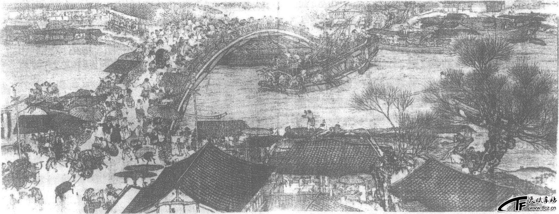 宋·张择端作。绢本设色,纵24.8厘米、横528.7厘米长卷,现藏故宫博物院。画卷描绘北宋首都汴梁(今河南开封)汴河两岸物阜民丰繁荣热闹的景象。画卷右边以村郊田野村落开端,赶集人和驮运的骡马从田间小路向城里集中,路旁树木萌发现出北国早春的气息。人流穿过丛丛苍劲老树,来到街道,水波激荡的汴河出现在画卷上,成为画卷中的主题,并沿汴河展开。运货舟船过拱桥是精采的一幕,岸上纤工俯身前行,准备驶过拱桥的木船,船桅已放倒,船工握篙盘索,各个紧张忙乱神态逼真;桥上人群挥臂助阵,喧呼嘈杂;行人聚集桥头围观,形成画卷中第一个高潮。那些赶脚、推车、挑担的人们,自无 ......