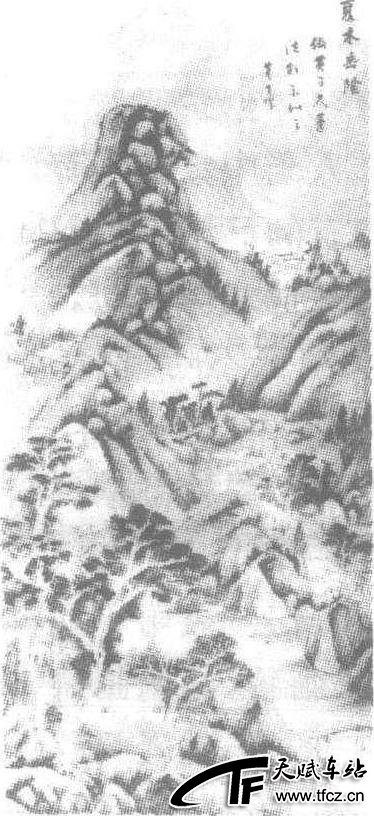 明·董其昌作。绢本设色,纵145.3厘米、横66厘米,现藏广东省博物院。此图描绘夏日山间苍翠景色。高山峭峰耸立,山石圆浑秀润,鲜苔密布。远山谷坡之间树立葱茏、层林迭翠,近景参天古树两棵,枝壮叶茂,周国杂树丛丛,形成一片凉荫,茅舍数间隐在其中,其旁小桥之下,清溪潺流。远处山间飘逸岚气,树荫里隐藏庙寺、小村。图中山丘丛树,草木密茂,清溪幽谷,秀丽湿润,呈显出一派江南山水沉郁清秀的自然风貌,画出文人隐逸的情趣。自题“夏木垂阴”,落款玄宰画,白文印章“太史氏”、“董其昌”。