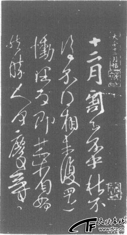 为王献之草书的代表作。该帖由开始行楷书渐变为行草书,字多联属,笔势奔放,可见王献之善一笔书之长。帖中写的内容为:“十二月割至不中秋不复不得相未复还恸理反即甚如何然胜人何庆等大军。”原墨迹曾为宋代米芾所收藏,此帖宋代曹之格刻入《宝晋斋法帖》第一卷中。对唐代草书家张旭、怀素等人影响深远。