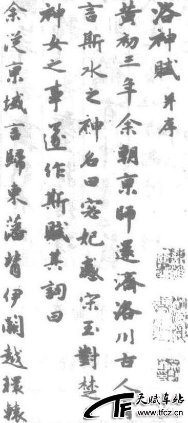 元赵孟頫书法帖。纸本墨迹卷,帖高29厘米,横22.9厘米。书法透逸精严,绝天沓拖偏侧之失,是存世赵书之精品。王觉斯跋称:“光怪夺目,真沉泗之鼎复现人间。”卷后有李路、王铎等跋。今藏北京故宫博物院。赵氏另有《洛神赋》一卷,系其早期之作,运笔结字稍雅嫩。今藏辽宁博物院,有影印本行世。