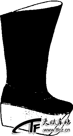 又称“厚底靴”。高帮、方头、白厚底,靴面一般为黑色缎面,少为布面。为剧中生、净文武官员穿用。