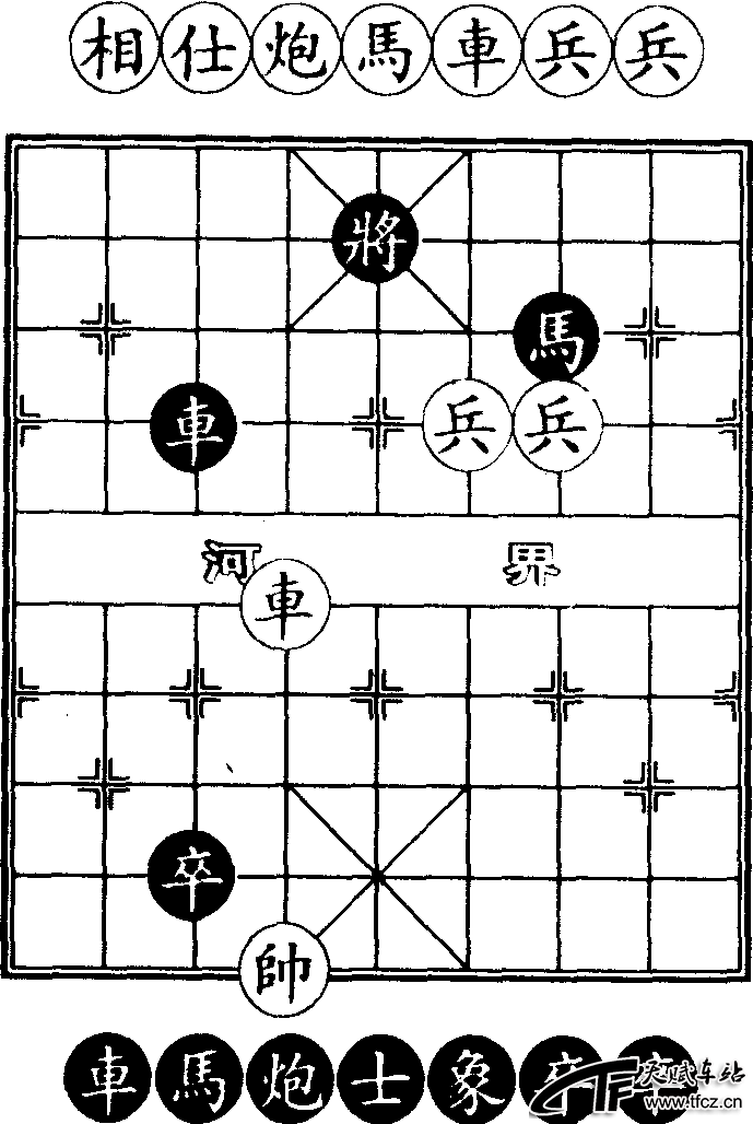 棋盘系由9道纵直线和10道横线交叉组成,在棋盘上形成90个交叉点。棋盘中间没划通纵直线的地方叫“河界”,双方棋局后中部划有交叉线(使4个格划成米字形)的地方叫“九宫”。棋子总共有32枚,分黑、红,各占16枚,各刻有7种名称。红棋子:帅1枚,车(音ju)、马、炮、相、仕各2枚,卒5枚;黑棋子:将1枚,车、马、炮、象、士各2枚,兵5枚。对局开始前,双方棋子放在棋盘上相应的固定交叉点上,行棋时,按行棋规则棋子可走在90个交叉点上,每个交叉点只允许落1枚棋子。