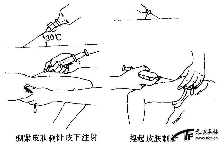 是将药液注入到疏松的皮下组织内治疗疾病的一种方法,它比口服吸收快。常用的注射部位有上臂外侧上1/3处,大腿内侧、下腹部等,注射时使用的是经过消毒灭菌的或一次性使用的注射器,注射器和针头各部的名称(图2—2—5)。注射前应先洗净双手戴口罩准备药物,一般注射药贮存在安瓿或密封的药瓶中(图2—2—6)。吸取安瓿药液的方法是先用手指轻轻弹下安瓿尖端的药液,用消毒灭菌棉签蘸75%酒精擦拭安瓿颈部,用砂轮在颈部锯一痕,大而粗的安瓿需锯一圈,再用酒精棉签擦去屑沫,用棉块垫着安瓿颈部掰开。左手中指食指夹住安瓿,右手持注射器吸取药液,针头斜面向下插入安瓿,不可触及安 ......