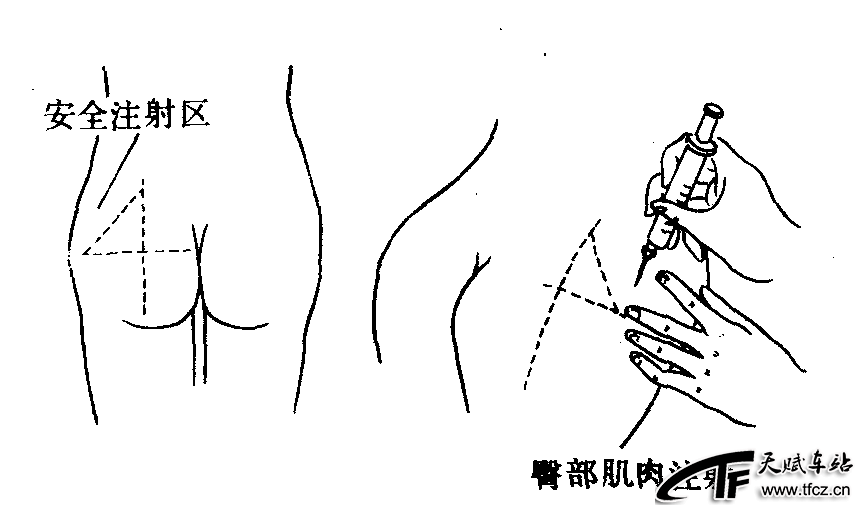 是将药液注入到肌肉中的方法,肌肉血管丰富吸收快。注射部位一般选用臀部臀中肌、臀小肌和股外侧肌注射。臀部肌内注射部位选择方法是在臀部沿臀裂顶点画一横线,再在横线上画一垂直平分线,注射点在外上1/4的外上三角区,此处肌肉肥厚又远离坐骨神经和大血管,是臀部肌注的安全区。注射的步骤同皮下注射法①②③;④左手拇食指将注射部位皮肤绷紧,右手拇食指握注射器,中指4指固定在针栓上,小指伸出以控制针头刺入深度,垂直90。角快速刺入肌肉(图2—2—9)。再用左手抽动活塞,查看无回血吸出,即可将药液推入。注射完毕拔出针头用棉签或棉块按压针眼片刻,不要用力揉压,以免 ......