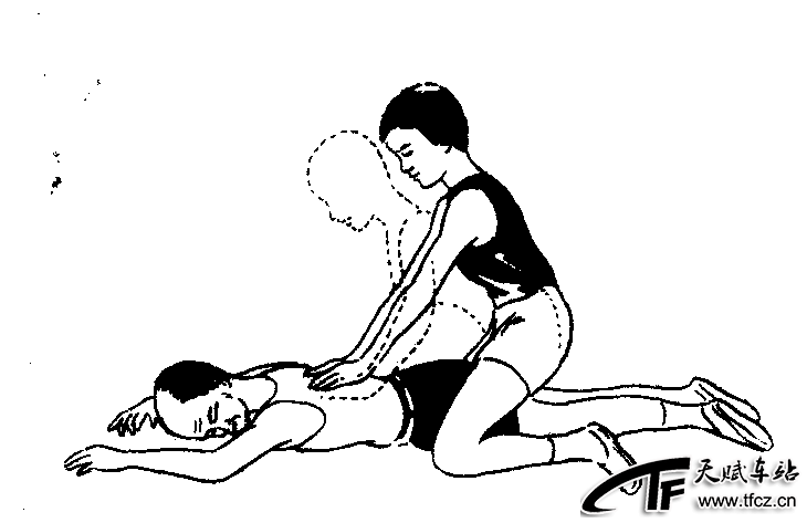 是运用人工操作的手法,使失去自主呼吸的病人能继续维持肺脏的呼吸功能。进行人工呼吸前要清除口鼻的异物,除去活动假牙,解除紧束颈胸部的衣服,保持呼吸道通畅。必要时用钳拉出后坠阻碍呼吸道的舌头。口对口吹气法快速简便易行,方法是病人平卧头向后仰,操作者托起其下颌使之张口,在口上盖一块纱布或手帕,一手捏紧病人的鼻孔,深吸一口气对着病人口部吹入,看到病人胸廓隆起时,停止吹气同时放开捏紧的鼻孔,使其胸廓复原。如此反复进行每分钟16~18次(图2—2—19)。俯卧压背法是病人俯卧头偏向一侧,胸腹部贴地,双臂伸过头一臂枕于头下,另一臂向外伸展,以使胸部扩张。 ......