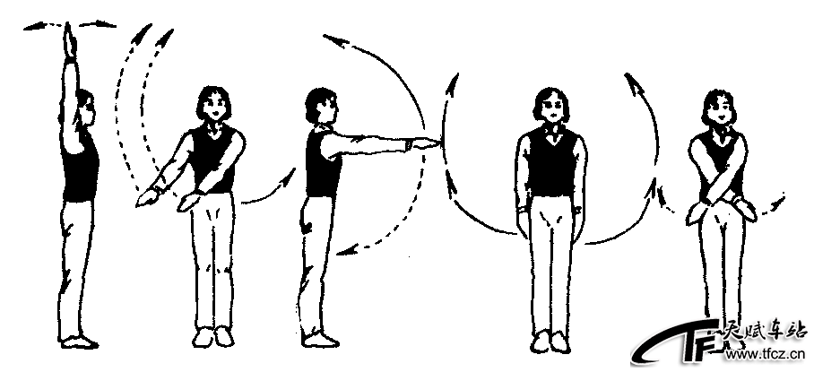 以肩关节为轴,两臂进行各种方向和范围的练习。其主要练习类型有举、振、绕、绕环、挥摆等。举:臂的活动范围不超过180°,并静止在某一部位。如前举、侧举、上举(图2—3—1);侧上举、侧下举、前上举、前下举;前斜上举、前斜下举等。振:肌肉爆发性的收缩,使臂做加速的弹性运动,关节活动范围达到最大限度。振有臂上举后振、臂侧举及下垂后振。振时臂伸直或弯曲。绕和绕环:臂活动范围在180°以上,360°以内称绕,超过360°(含360°)称绕环。根据两臂开始部位不同又分向前、后;向左、右:向上、下;向内、向外的绕和绕环(图2—3—2)。挥摆:两臂进行前、后、左、右钟摆式摆动。人过50岁后 ......