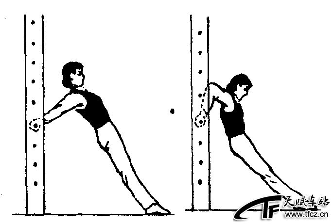 面对肋木压肩面对肋木站立,两手扶在同腰、髋高的位置上,做体前屈,挺胸抬头,肩胸带动上体主动向下振压(也可有同伴加助力练习)使肩角拉开。