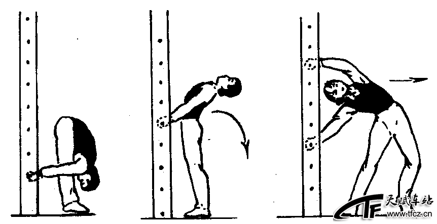 是利用肋木来发展腿部的前、侧、后肌群的伸展和迅速收缩的能力以及髋、踝关节灵活性的一种柔韧性素质练习。其练习的方式方法很多,一般经常采用前、侧、后等三个不同方向的压、掰、踢、控、劈腿等方式来进行。老年人可选择以下几种练习的内容: