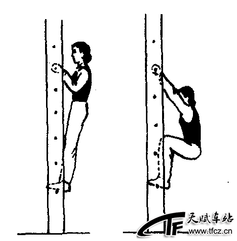 悬垂引体面对肋木,站于肋木下端横杆,屈膝全蹲,两手伸直上举握木杆开始,用力拉臂,引体向上,并使腿伸直,如老年人臂力不足,可借助伸腿配合适当用力。也 ......