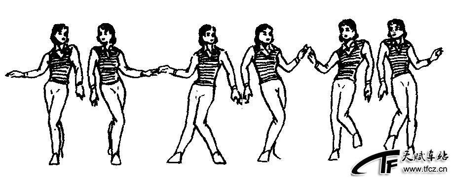 是健美操动作主要内容之一,包括各种走及舞步练习,能有效地加强老年人的协调性、节奏感及表现力。通过与手臂动作及身体各部位动作的配合练习,使其练习时更具有情趣,加上形式多变,极易使练习者达到引人入胜的境界。动作要领是: