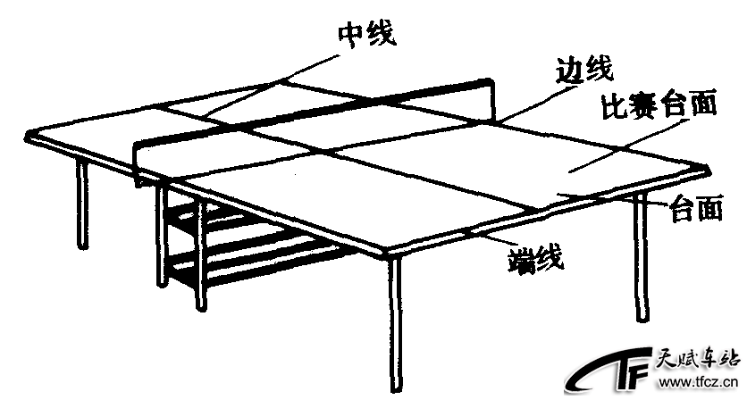 乒乓球比赛的双方是在一张长2.74米,宽1.525米,高76厘米的暗色无光泽的球台上进行的。球台的中央有一条垂直于台面长为1.83厘米、高为15.25厘米的球网将台面分成两个相等的台区。各边有一条2厘米宽的白线。沿2.74厘米的台面边缘所画的线叫作“边线”;沿1.525米长的台面边缘所画的线叫作“端线”。“比赛台面”应包括台面的上边缘,不包括台面上边缘以下的“侧面”。台面中央由一条与端线垂直3毫米宽的白线叫作“中线”,将两个台区划分为两个相等的左、右半区(图2—3—32)。球网包括网、悬网绳和支架。在比赛中,球擦网、擦网绳或支架均称为“擦网”。乒乓球为圆形,重2.5克,直径为38毫米 ......