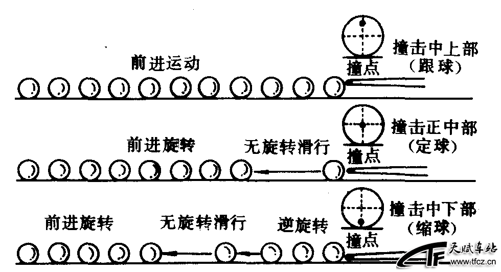 台球击球时使球得分的撞击方法。例如保持球杆水平状态,撞点在球中心的上部,撞击后球按照球杆行进方向向前转动前进,这叫“跟球杆法”;本球在一定期间内无旋转行进,然后开始转动,这叫“定球杆法”;撞击中下部时,球最初是沿着球台滑行,随后转为向后转动,进而改变为无旋转滑行,最后转为普通的滚动,这叫“缩球杆法”等。(图2—3—38)