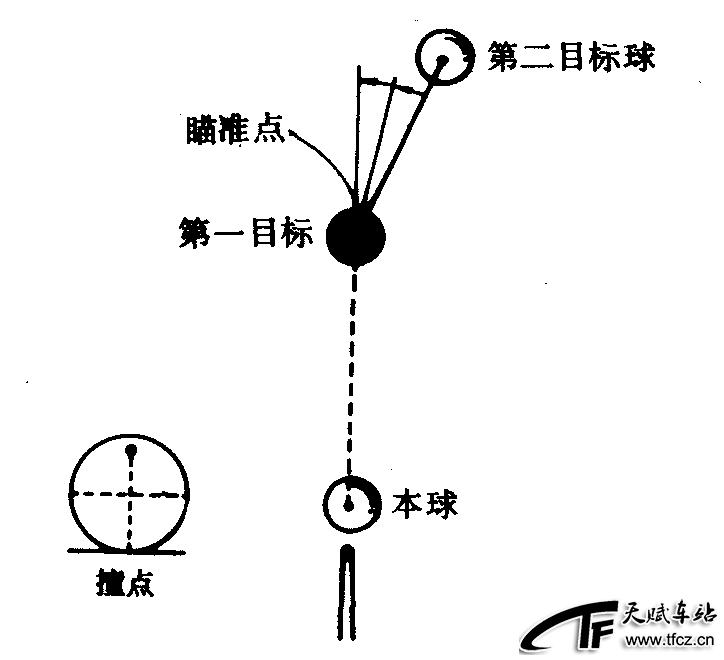 台球击球的一种方法。是用撞点为中上部的杆法击球,本球碰撞第1目标球,该球被撞走之后,本球随着继续前进,去碰撞第2目标球。跟球的基本瞄准方法是以第1目标球和第2目标球的中心为连结线,再以本球和第1目标球的中心连线延长,将这两条线形成的角度二等分,在第1目标球的外缘有个相交点,即为跟球的瞄准点。(图2—3—39)