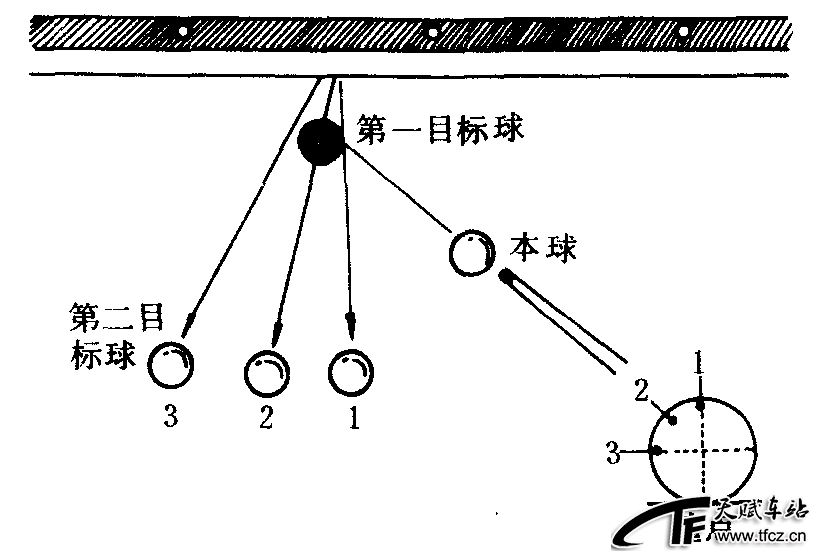 台球击球的一种方法。当第一目标球靠近岸边,先使本球碰撞第1目标球后碰岸,然后再碰撞第2目标球。切球的基本瞄准方法是先将第2目标球的位置与本球和第1目标球连结成线,再取好撞击角度。还应注意变化本球撞击第1目标球的厚度和撞点,撞击方法的变化,要随着第2目标球的位置而异。如图所示(图2—3—43)撞点变化其反射角也随之变化,碰撞第1目标球的厚度不同,其分离角也会引起不同的入射角变化。