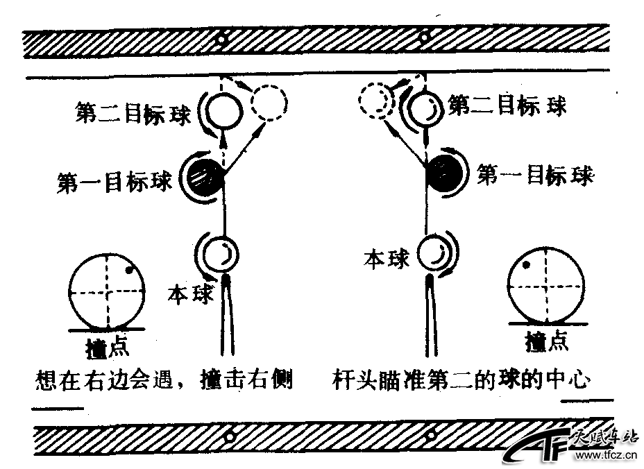 台球击球的一种方法。本球先碰撞第1目标球,使第1目标球碰撞第2目标球,使第2目标球碰岸,然后反弹回来再与本球相遇。打会遇球是在本球与两个目标球并列一条直线时,或是第1、第2目标球靠岸很近时使用。3球并列成一直线时,在岸边与第2目标球之间,第1目标球与第2目标球之间,以离开1个球的直径距离以上,才可能打出会遇球来。会遇球基本瞄准方法是想在左侧会遇,就要撞击本球的左侧。想在右侧会遇,就要撞击本球的右侧。杆头要对着第2目标球的中心瞄准。(图2—3—45)