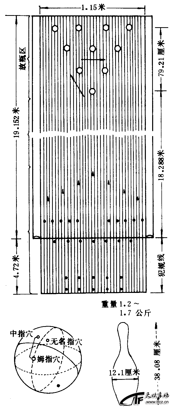 保龄球球场包括助跑道、球道和后台。(见图2—3—61)辅助投球动作的助跑道约长4.60米,宽度与球道相同。供保龄球滑滚的球道长19.16米、宽1.15米。球道的板面由水平的枫木或松木组成,一般为39块小木板拼成,助跑区与放置球瓶的区域采用枫木,中间采用松木。助跑道与球道之间的连线为犯规线,宽度为9.5~25厘米。球道与助跑道的表面嵌有塑胶标识点。犯规线前方3.65~4.87米处嵌入的三角形标识叫做目标标识点;犯规线前方1.82~2.42米处嵌入的与犯规线平行的圆形标识叫做引导标识点;犯规线后5~15厘米处嵌有脚步标识;犯规线后2.35~3.55米处嵌有助跑标识。这4种标识是为投球及选择球的行进路线而设 ......
