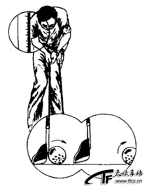 是近距离击球入穴的常用方法。握法采用倒逆重叠法,右手直接握在球杆上,较易控制挥击的方向、力量和速度。挥杆时,双臂紧贴在身体上,大臂参加不多,主要是前臂及手腕用力完成推击。球位于左脚前方,是在左脚内侧的延长线上。两脚几乎并拢,挥击时亦无重心转移之要求,差不多全在左脚上。这时杆头击球面与挥击及球前进方向垂直。挥击时,以右臂用力为主,根据穴的距离、方位、地形情况,判定用力的大小。左手主要协助右手的用力,以小指牢牢固定球杆,以保证准确无误地击中球。(见图2—3—77)