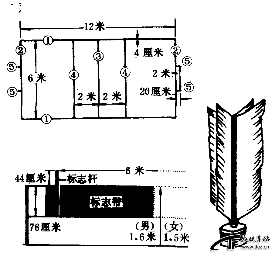 比赛场地为长方形,长12米、宽6米。场地界线的宽度为4厘米。场地上空6米以内(由地面计算)和场地四周2米以内不得有障碍物。说明:1.①边线、②端线、③中线、④限制线、⑤发球区线。2.边线、端线、中线、限制线的宽度包括在其场区面积之内,发球区线的宽度不包括在其场区面积之内(见图2—3—79)。