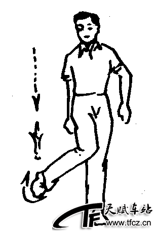 踢毽球基本技术动作之一(图2—3—84)。以右脚踢毽球为例:两脚左右自然分开站立,两腿微屈,身体重心移至左脚上,一手将毽球向右上方抛起。当毽球下落至右侧腿膝关节处时,以大腿带动小腿膝上提,同时膝关节相应稍向内收、脚腕向外翻、勾脚尖,用脚背外侧向上迎击毽球。
