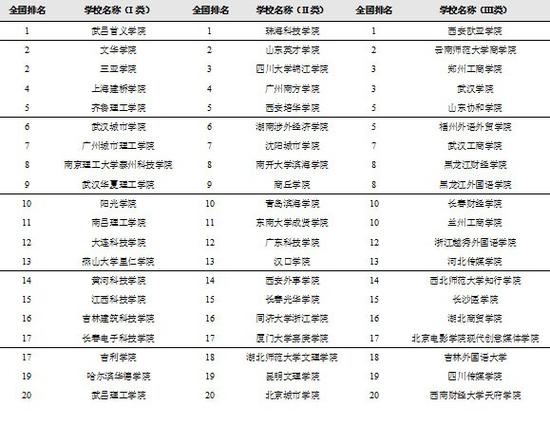 武昌首义学院、珠海科技学院、西安欧亚学院、山东协和学院、黑龙江外国语学院、河北传媒学院、西北师范大学知行学院、华南农业大学珠江学院、黑龙江工商学院、武汉体育学院体育科技学院等位列校友会2021中国理工类、综合类、财经类、医药类、语言类、艺术类、师范类、农林类、财经类和体育类民办大学排名第一。